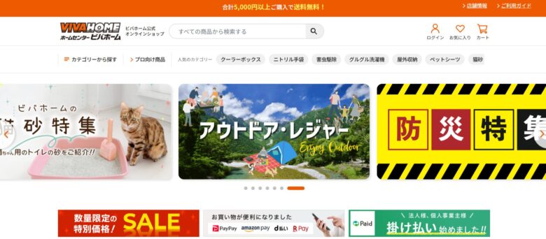 ビバホームは洗剤やキッチン用品といった生活必需品から収納用品、工具や建築資材まで幅広い商品を取り扱っている店舗です。オンラインでは、車を持たない人でも自宅からワンストップで必要なものを購入できます。
